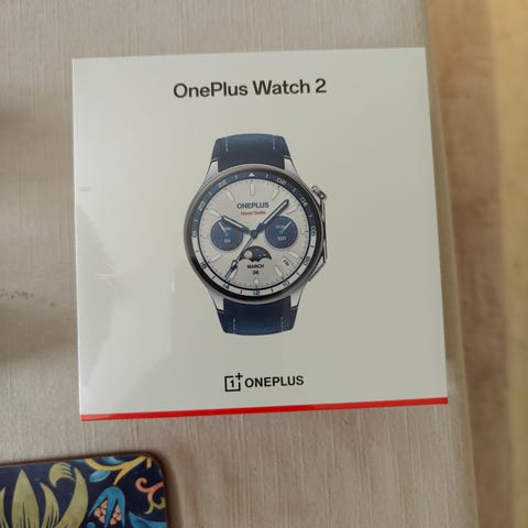 OnePlus Watch 2 smartklocka för unisex. Produkten har funktioner för hälsomätning och smarta aviseringar. Klockan har en rund urtavla med blått armband och en vit urtavla. Lämplig för dagligt bruk och hälsosam livsstil.