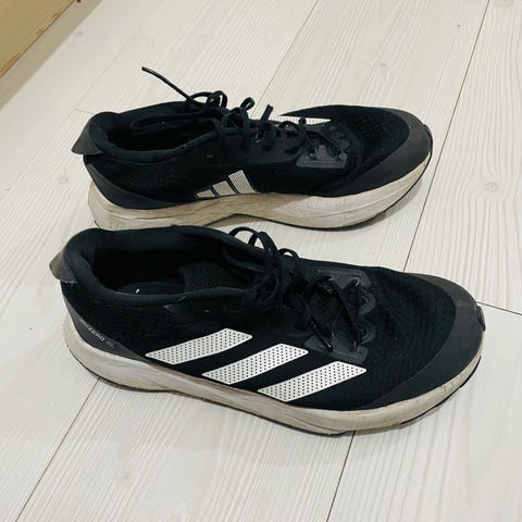 Adidas löparskor i storlek 41 1/3, designade för löpning. Skorna har en stickad ovandel i ljusa färger och en vit sula med greppmönster under. Passar för löpträning och vardagligt bruk.
