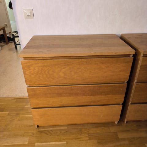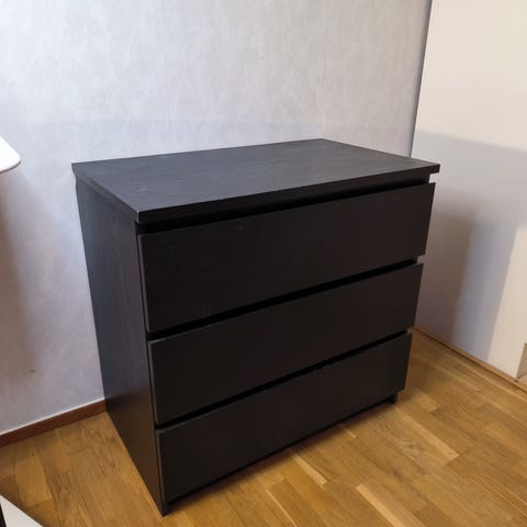 En liten vit byrå bortskänkes. 3 lådor.