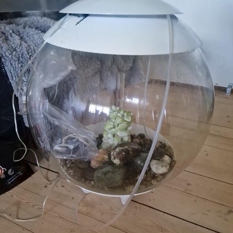Juwel akvarium med vit skåp. Akvariet är placerat på ett vitt skåp med två dörrar och en öppen hylla i mitten. Akvariet innehåller växter och dekorationer såsom stenar och grus.