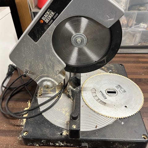 Kap- och geringssåg med metallkonstruktion och elektrisk motor. Utrustad med justerbar vinkelinställning för kapning och geringssågning. Passar för träbearbetning och byggprojekt.