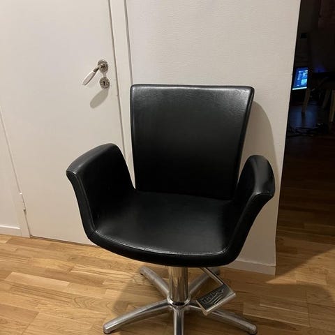 Frisörstol i okej skick. Fungerar som vanligt men har lite problem med att justera lutningen, går att luta bakåt någorlunda.