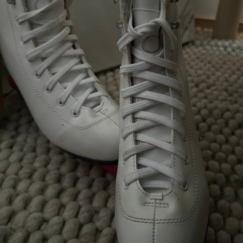Jofa Piruett konståkningsskridskor i storlek 41. Skridskorna har en klassisk design i vitt läder, snörning och med metallblad av svenskt stål.