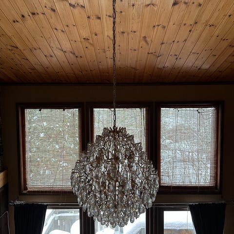 Kristallkrona med glaskupor för vardagsrum. Ordinarie pris 125 000 kr. I bra skick, men metallen runt lampan har blivit lite fläckig. Inget som syns på avstånd.