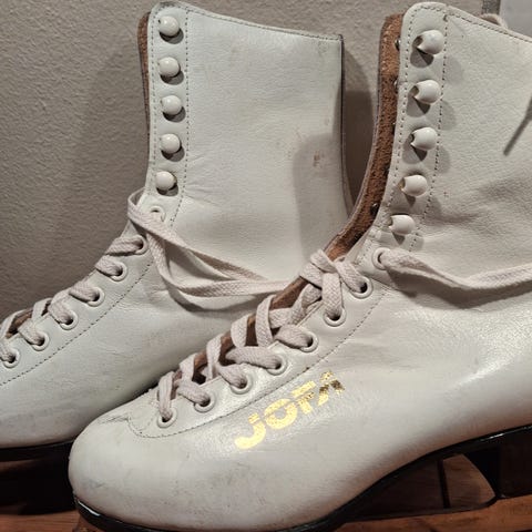 Jofa konståkningsskridskor i storlek 39, är avsedda för allmän skridskosport. Skridskorna har en klassisk design i vitt läder, snörning för justerbar passform och med metallblad av svenskt stål.