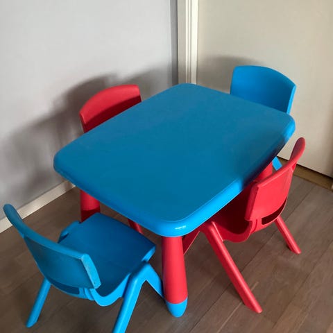 IKEA barnmöbelset bord och två stolar i trä och vitt