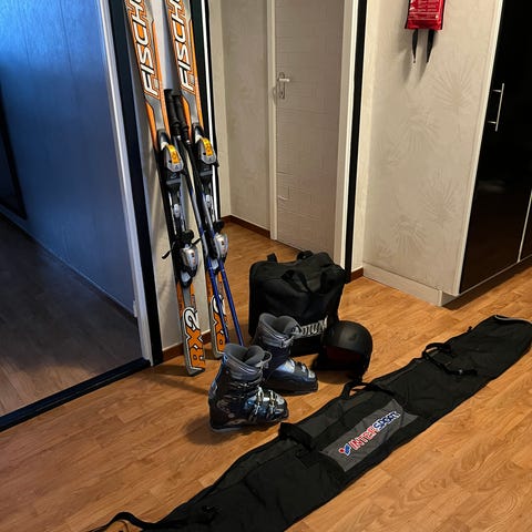 Blizzard skidor med bindningar, Salomon skidpjäxor i blå färg med spännen för justering, stavar (SCOTT) samt en hjälm (POC) i silverfärg. Skidorna har en design i grått, rött och svart. Komplett skidutrustning för vintersport.