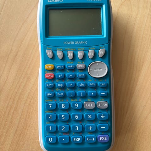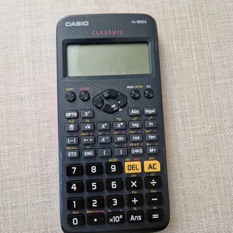 Casio Natural-V.P.A.M miniräknare med flerfunktionsdisplay och omfattande uppsättning vetenskapliga funktioner. Räknaren har numeriska tangenter, funktionsknappar för bland annat trigonometri, logaritmer och potenser samt särskilda knappar för minne och radering. Framsidan är mörk med färgmarkerade knappar och baksidan har ett grått skyddsskal med Casio-logotyp. Lämplig för matematik- och naturvetenskapsstudier där en vetenskaplig miniräknare behövs.