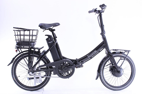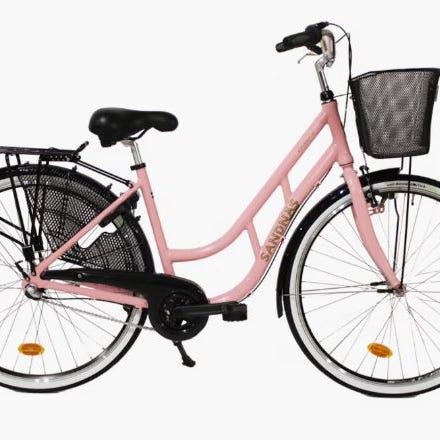 En komplett cykel med pakethållare, korg, stöd och belysning.
