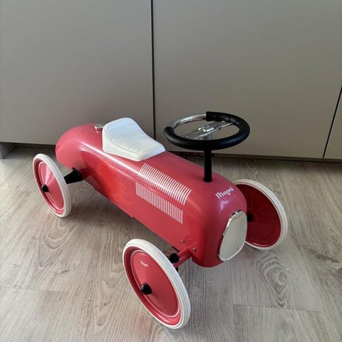 Säljer en robust röd brandbil i trä från tyska kvalitetsmärke GOKI. Mått ca 16,5 x 9 x 10,5 centimeter. Med en slang (snöre) som kan dras ut och rullas upp. Med en brandbilschaufför som sitter fast i bilen. Med gummerade hjul. Rekommenderat från 2 år.