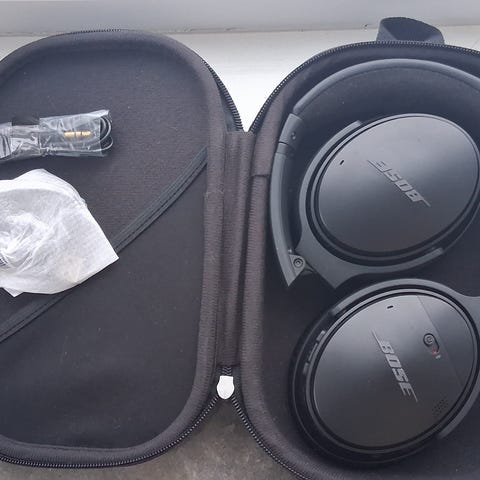 Bose hörlurar med medföljande skyddande fodral. Hörlurarna är svarta och har en över-ear design. Fodralet är hårt och svart med Bose-logotyp.