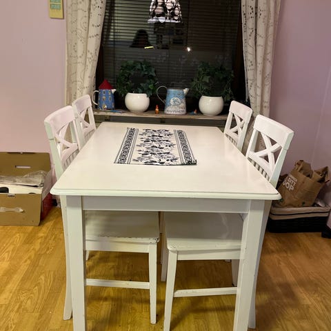 Stabil konstruktion med bed i metall. Knappt något slitage på bordsskivan.