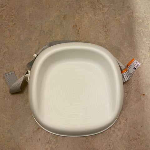 Babybjörn barnstolssits i vit färg. Sitsen har säkerhetsremmar för fäste på vuxenstol så barnet kommer upp vid bordet, se sista produktbilden. Materialet är sätt att rengöra.