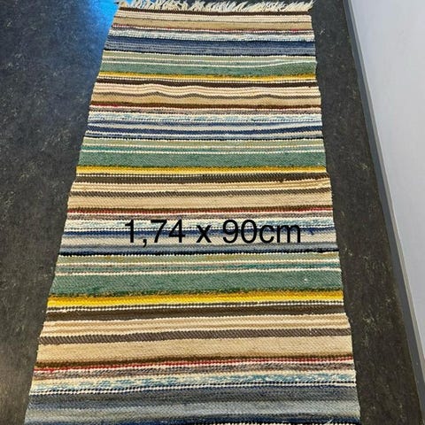 Handvävd matta med randigt mönster i naturfärger. Mattan är tillverkad av textilmaterial och har en rektangulär form. Passar för användning som golvmatta i olika rum.