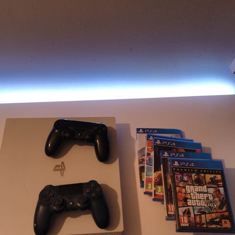 Playstation 4 Pro spelkonsol i svart färg. Inkluderar en trådlös handkontroll. Konsolen är avsedd för spel och multimediaanvändning.