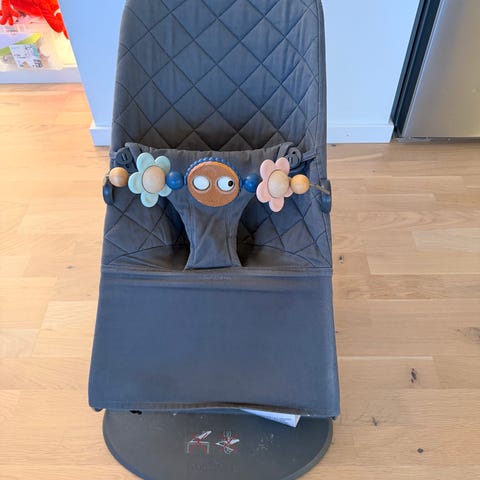 Babysitter och lekbåge från Babybjörn. Grå Jersey tyg i använt men mycket fint skick. Lekbåge fint skick utom några bitmärken, se bilder.