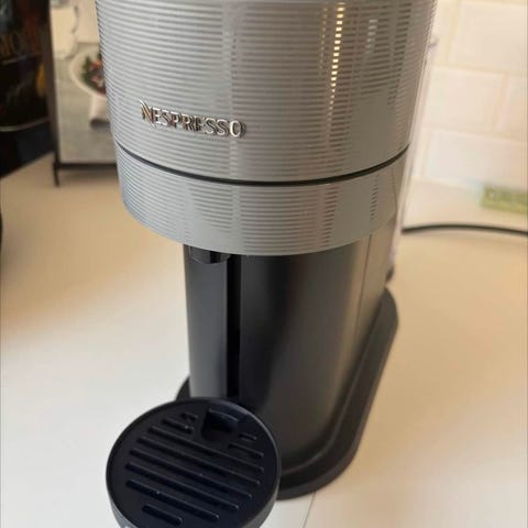 Nespresso Vertuo Next kaffemaskin i färgen vit och svart. Maskinen är designad för att brygga kaffe med Nespresso Vertuo kapslar och har en kompakt storlek som passar i de flesta kök.