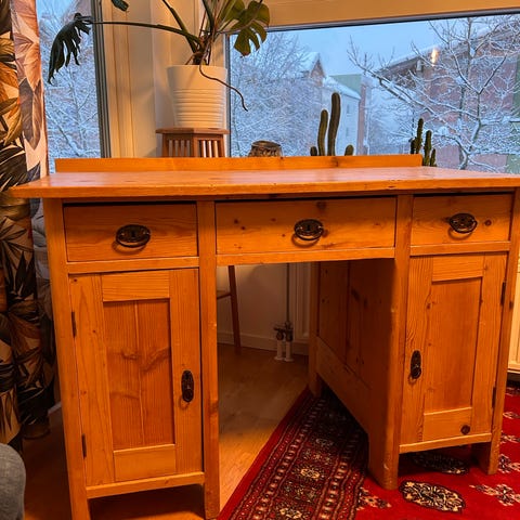 Litet äldre skrivbord med stol, gott om patina, men charmigt i rätt hem.