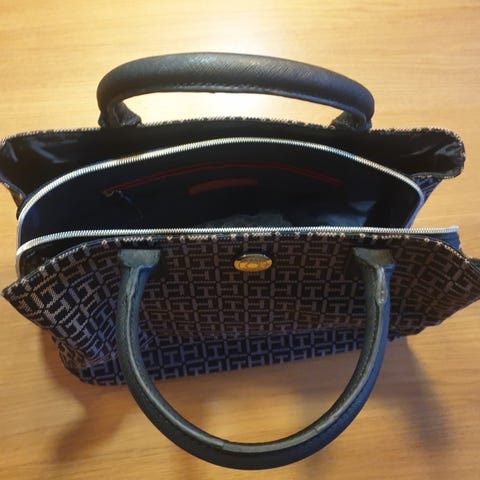 Tommy Hilfiger väska. Väskan har ett mönstrat yttre med bruna detaljer och två bärhandtag. Den är designad för vardagligt bruk och kan användas för att bära personliga tillhörigheter.