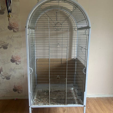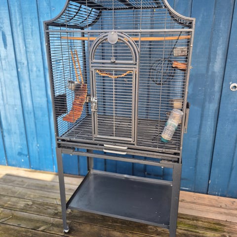 Stor fågelbur 81x58x175. Finns givetvis dörr men den är just nu av. Denna buren används inte då dom har större. Passar små till mellanstora fåglar. Inga tillbehör, men lite Matskålar osv. Sittpinnar mm.