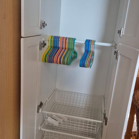 IKEA Platsa garderob med två dörrar i ljusgrå färg. Måtten är 79 cm i bredd, 57 cm i djup och 181 cm i höjd. Garderoben har flera hyllplan och en klädstång för förvaring av kläder och andra föremål. Belysning medföljer, som tänds när man öppnar dörrarna. Finns ett litet märke på ena dörren.