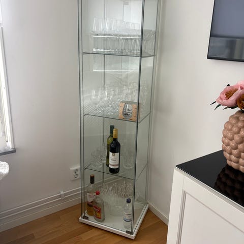 IKEA Vitrinskåp med glasdörrar i vitt utförande. Skåpet har två glasdörrar och flera hyllplan för förvaring och visning av föremål.