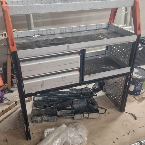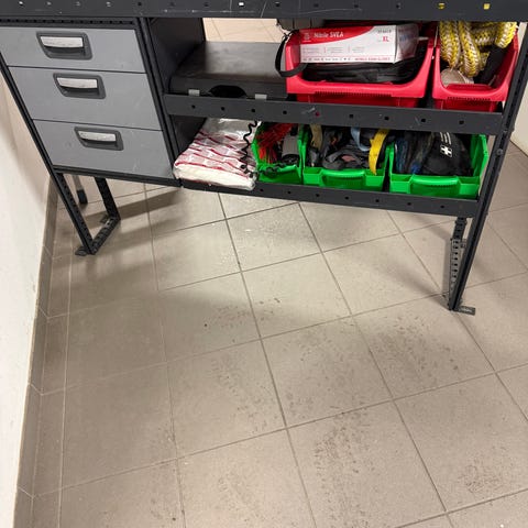 Begagnat förvaringsskåp för skåpbil med lådor och hyllor, mått 1160 lång, 485 bred och 930 hög plus släde.
