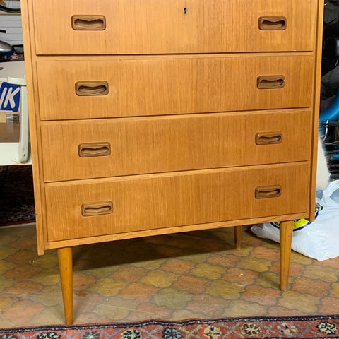 Teak Byrå i fint skick för sin ålder, lossnat fanér på de 2 nedersta lådorna dock (se bild) hämtas i Västertorp eller levereras för 500 kr