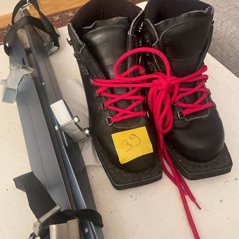 Lundhags kängor i svart färg, storlek 40. Tillverkade i läder med robust sula. Kängorna har röda skosnören och metallöglor för snörning. Designade för att ge stöd och skydd vid utomhusaktiviteter.med långfärdsskridskor