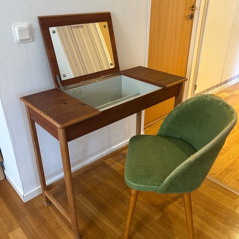 Säljer ett mycket fint retro sminkbord/toalettbord i teak, troligen från 50–60-talet pga flytt till mindre lägenhet.