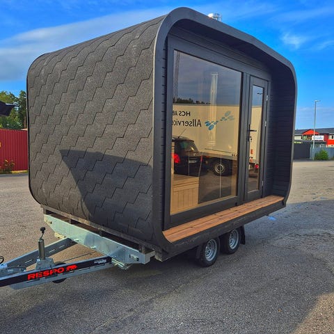 Bygglovsfri bastu med svensktillverkat Carlmans chassi från Sörmland.