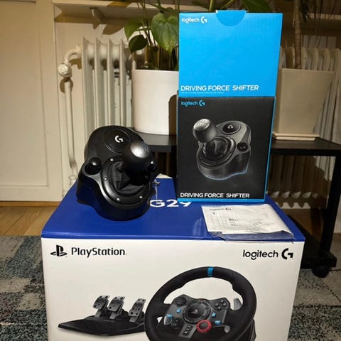 Logitech g29 Force feedback pedalset med gas broms och koppling även växelspak playseat challenge alla knappar fungerar på ratten och pedalerna och växelspaken är bra skick