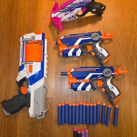 2 Nerf + de tillhörande skotten som syns på bilden.