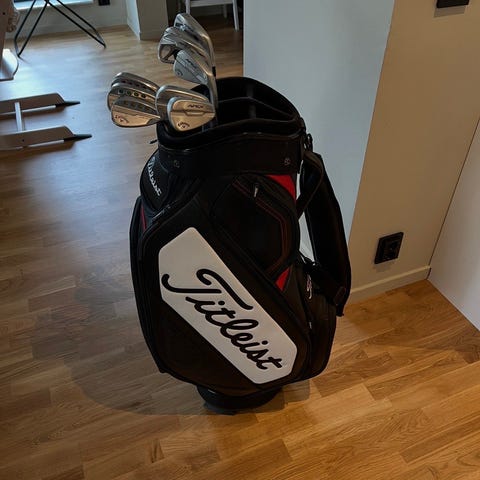Titleist vattentät vagnbag i svart och rött med flera fack för förvaring och organiserad uppdelning för 14 golfklubbor. Knappt använd, alla dragkedjor funkar. Nypris 3999kr