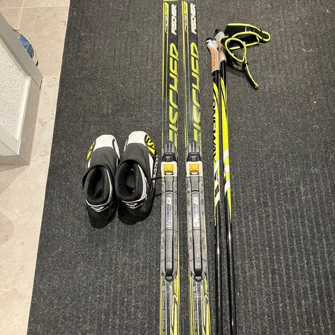 Längdskidor, pjäxor, stavar och slalomskida