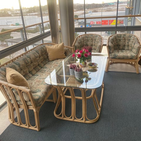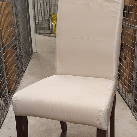 Fyra stolar totalt, två med blommigt överdrag och två med randigt.