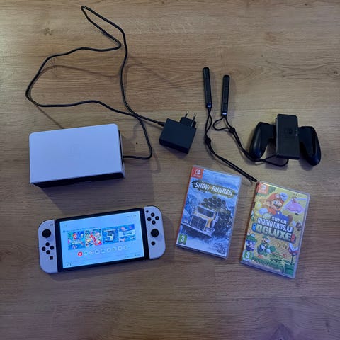 Fin med tanke på ålder(2016 modell, så går att modifiera) och fungerar utmärkt. Har tunna scratchlines på skärm och baksida, men inget som syns vid spelande. Minneskort på 128gb ingår. Ingen drift på joycons. Ingen hdmi-kabel ingår. Spelen är: