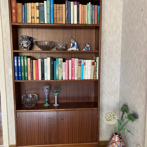 Bokhylla bortskänkes mot upphämtning. Luckan till barskåpet är lös i ena sidan men går att fixa.