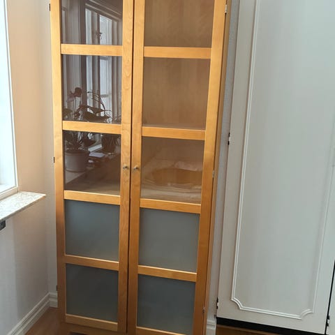 Vitrinskåp med flera lådor och öppna hyllor i bokfanér. Skåpet har glasdörrar på övre delen och metallknoppar på lådorna. Passar för förvaring och visning av olika föremål.