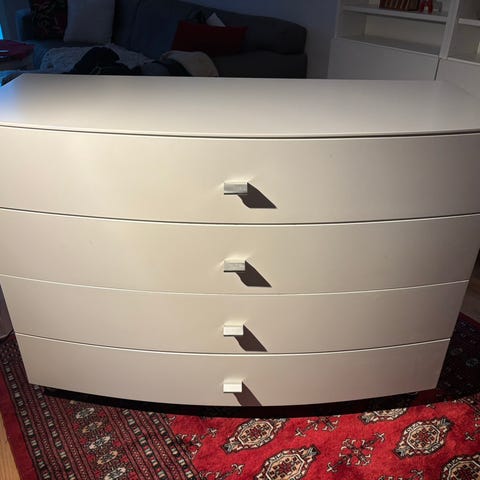 Byrå i FSC-certifierat furuträ och MDF. De fyra lådorna har fin rotting infälld i fronten. Varje låda har ett rejält handtag som är diskret och smälter in fint, i samma färg som byrån. Byrån har målats med vattenbaserad färg, rottingen är naturfärgad.