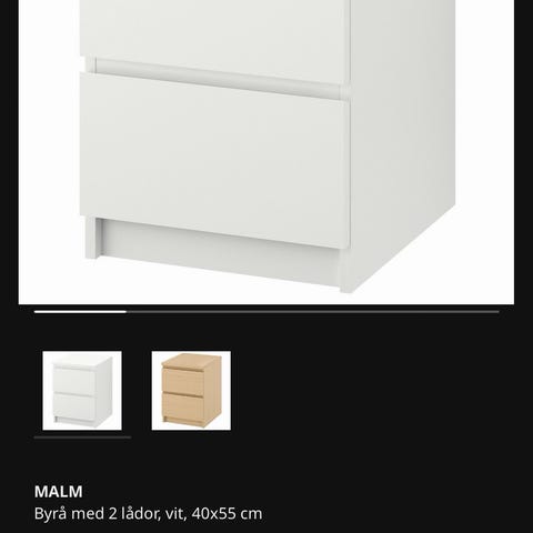 IKEA Malm byrå med 2 lådor i vitt. Den är designad för att fungera bra som ett sängbord på grund av sin storlek. Byrån på bilden har också en MALM glasskiva i vitt placerad ovanpå