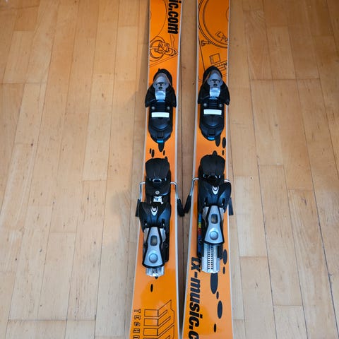 Alpina barnskidor av märket Rossignol med bindningar. Skidorna är 128 cm långa.