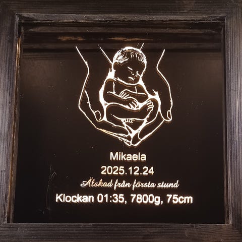 Nattlampan har en spegel på framsidan där det med laser bränts bort skiktet på baksidan av spegeln. På framsidan framträder då det som visas på bilden. I lådan sitter varmvit LED belysning som gör att den graverade texten syns tydligt.