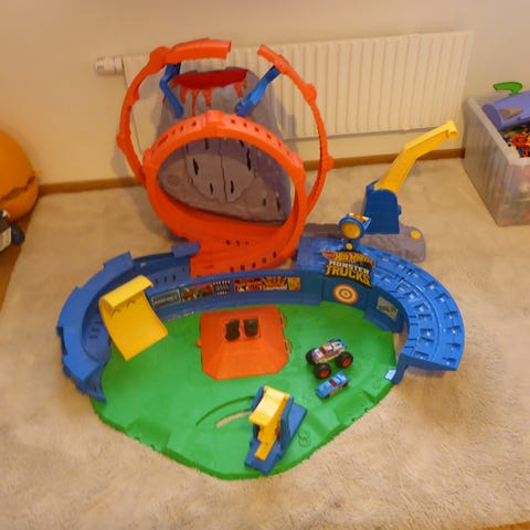 Hot Wheels Monster Trucks lekset med olika tillbehör och ramper för stuntkörning. Innehåller flera delar för att skapa en bana där monster trucks kan utföra hopp och trick. Passar barn som gillar bilar och actionleksaker.