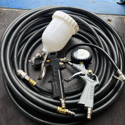 Sprutpistol av okänt märke i blå metall. Verktyget är utformat för att spruta vätskor och har en avtryckare i metall samt en anslutning för tryckluft. Passar för olika typer av sprutmålning eller beläggningsarbeten.