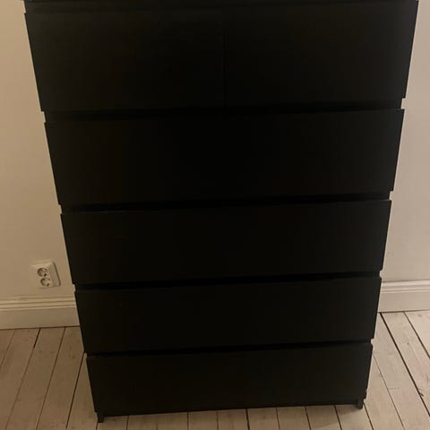 IKEA Malm byrå i vit färg med flera lådor i olika storlekar. Byrån har en enkel och modern design och är tillverkad av trämaterial. Passar för förvaring i sovrum eller andra rum.