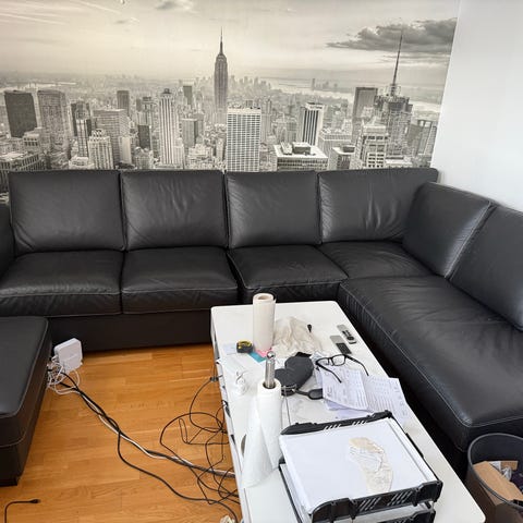 Hörnsoffa i brunt läder med plats för flera personer. Soffan är designad för att passa i vardagsrum och erbjuder en bekväm sittplats med modern stil.