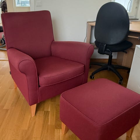 Fåtölj med fotpall från Fogia. Klädseln är avtagbar och tvättbar. Du somnar o den som en prinsessa efter några glas vin