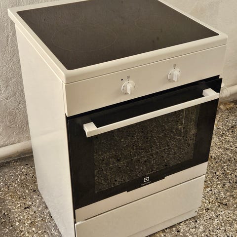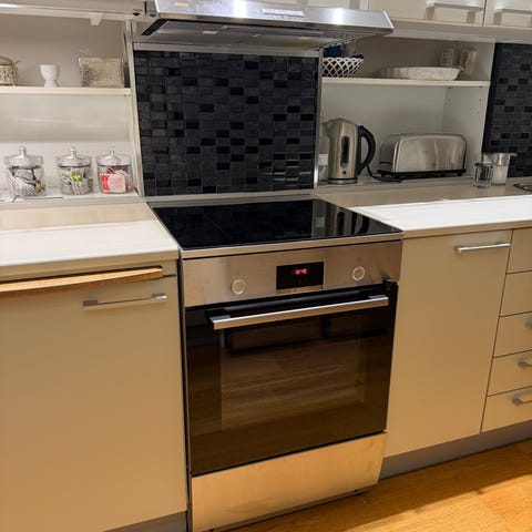 Husqvarna induktionsspis med glaskeramikhäll och ugn. Spisen har flera induktionszoner för effektiv matlagning och en varmluftsugn med belysning och fläkt för jämn värmefördelning.