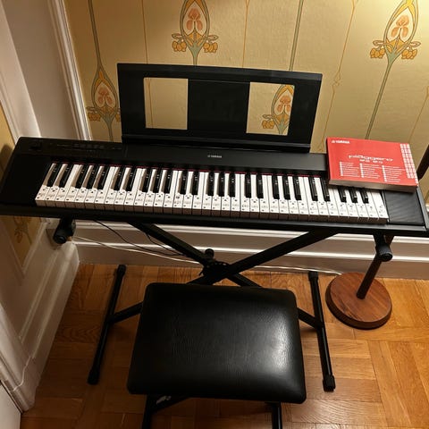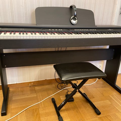 Gear4music DP-6 digitalpiano med svart finish. Pianot har 88 tangenter och är utformat för att efterlikna känslan och ljudet av ett akustiskt piano. Passar för både nybörjare och mer erfarna spelare.